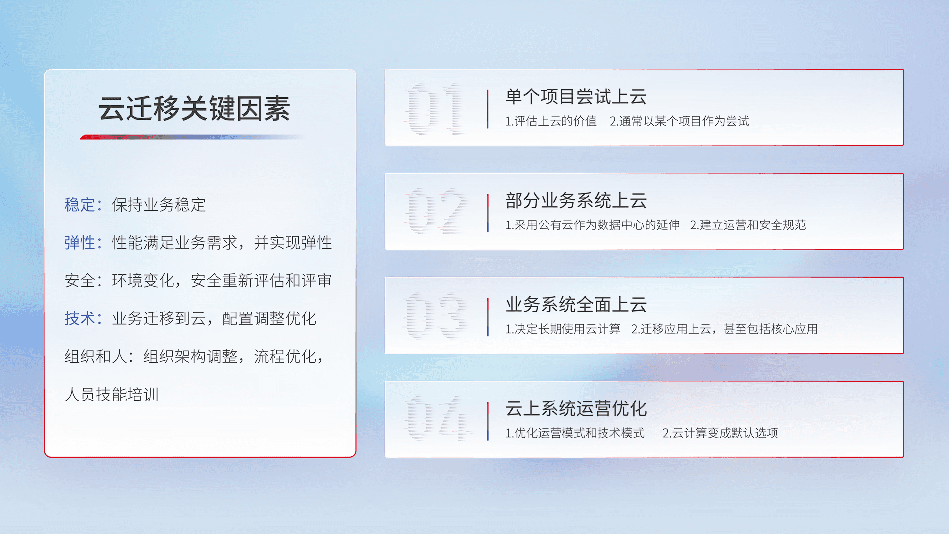 结合实际业务,,从规划设计、、云平台选型、、、、云原生改造、、数据迁移、、、、集成交付,,,,迁移全过程为客户识别最佳上云路径,,,,做好风险识别管理,,设计网络架构、、、身份权限、、安全审计合规、、操作审计、、日志审计、、、监控告警策略、、、、多站点容灾设计等,,对云上基础设施进行整体规划,,,提升IT治理水平,,,以满足弹性、、、高可用、、、、高性能的需求。。