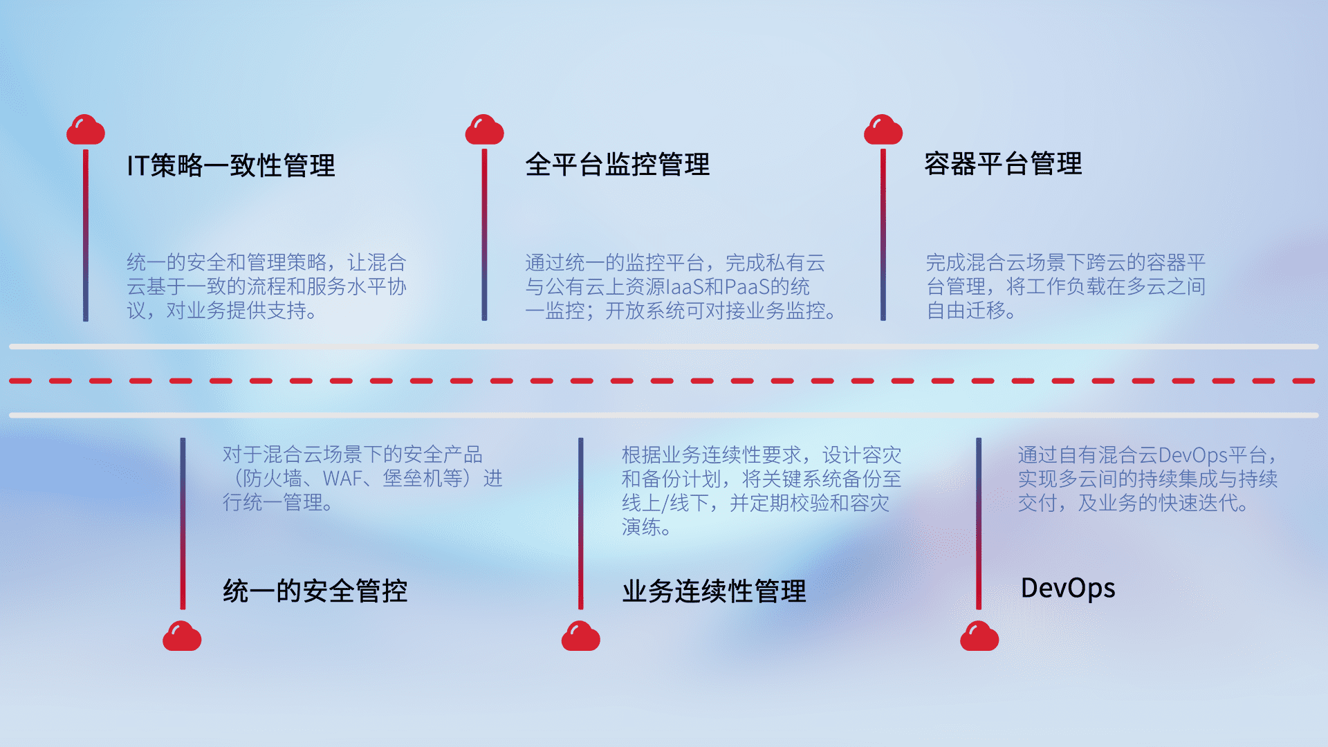 通过多云纳管,,以统一的资源数据模型把客户的云资源进行抽象和封装,,,,进而实现对多云资源的统一操作,,保障云资源管理的可靠性、、、、稳定性与可用性。。。。量身定制化运维内容,,,,配置、、、、开发运维、、补丁管理、、、、备份、、监控、、、认证和访问管理、、、、审计和日常巡检等,,,保障在用云过程中的可靠度,,稳定度以及高可用率。。